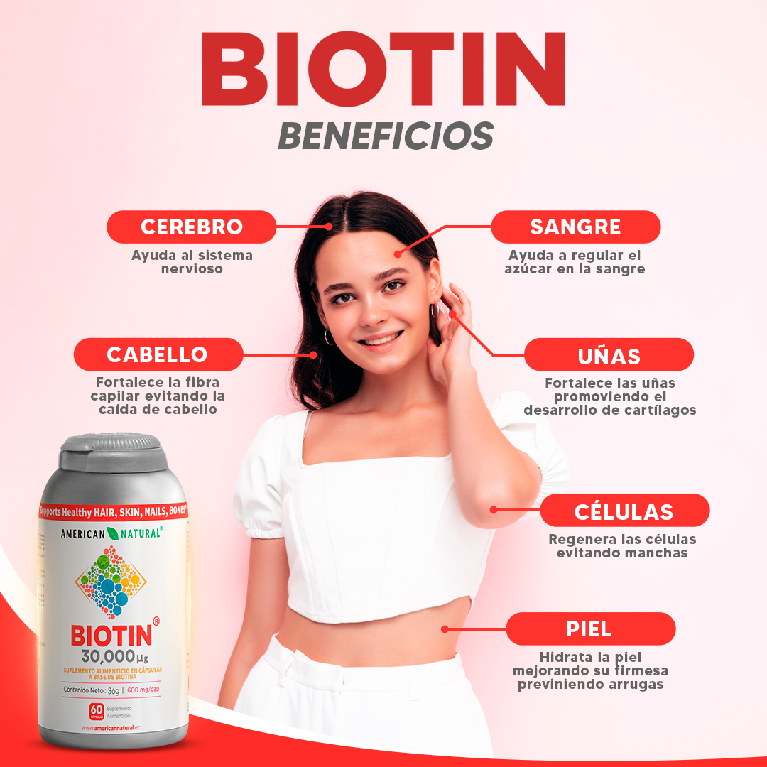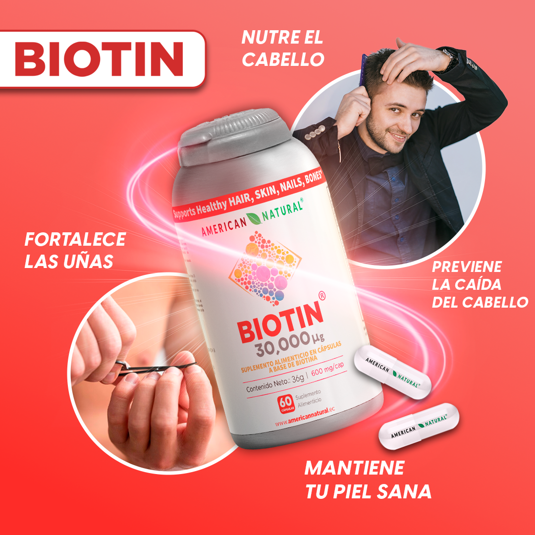 “El Biotin es una vitamina esencial que activa la producción de queratina en el cuerpo, promoviendo el crecimiento sano del cabello, fortaleza en las uñas y mejora en la piel.